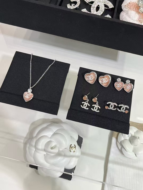 Chanel pink little heart silver full diamond double C earrings-3747